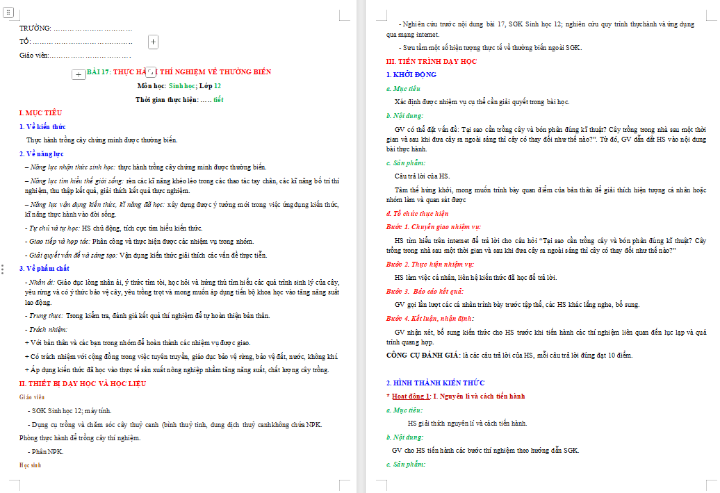 Giáo án Sinh học 12 Bài 17: Thực hành Thí nghiệm về thường biến ở cây trồng
