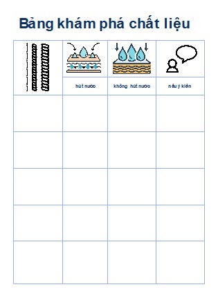 - Củng cố cho trẻ khả năng đưa ra bằng chứng về việc tìm kiếm và lập kế hoạch mới thông qua bảng ghi chép các vật liệu hút nước/không hút nước.