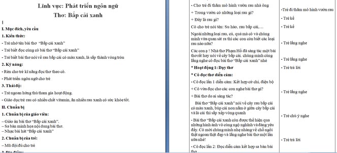 Ngoài File PowerPoint, giáo án thơ “Bắp cải xanh” còn có file Word có thể tải về và chỉnh sửa, mời các cô tham khảo.