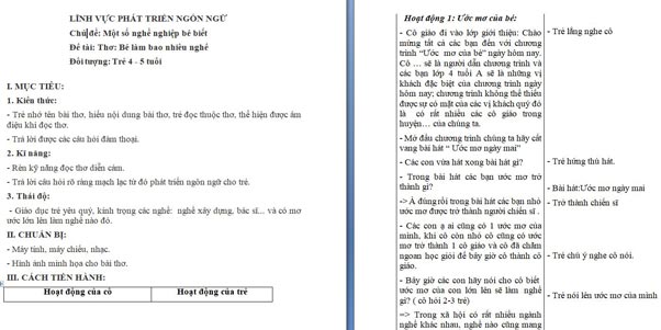 Ngoài File PowerPoint, giáo án thơ ‘Bé làm bao nhiêu nghề’ còn có file Word có thể tải về và chỉnh sửa, mời các cô tham khảo.