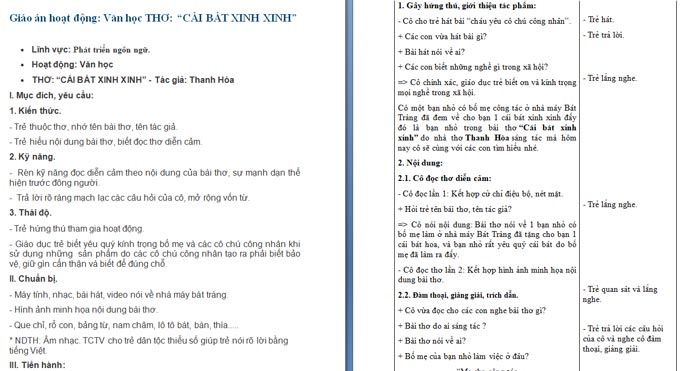 Ngoài File PowerPoint, giáo án thơ cái bát xinh xinh còn có file Word có thể tải về và chỉnh sửa, mời các cô tham khảo.