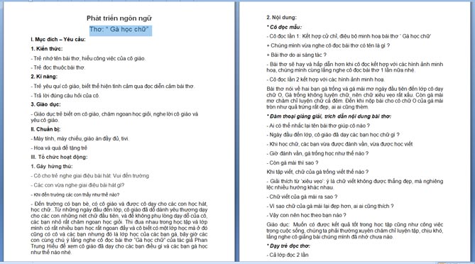 Ngoài File PowerPoint, giáo án thơ “Gà học chữ” còn có file Word có thể tải về và chỉnh sửa, mời các cô tham khảo.