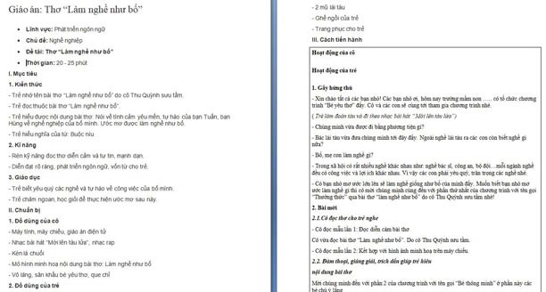 Ngoài File PowerPoint, giáo án thơ ‘Làm nghề như bố’ còn có file Word có thể tải về và chỉnh sửa, mời các cô tham khảo.