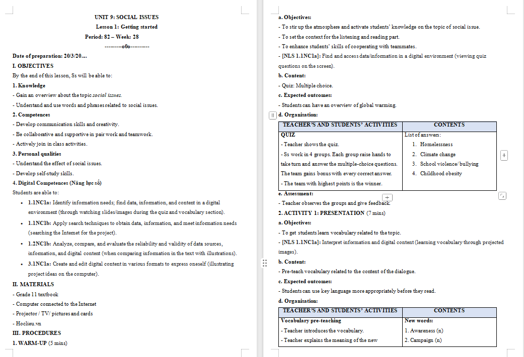 Giáo án Tiếng Anh 11 Unit 9: Getting Started trình bày dưới dạng file PowerPoint + Word đã tích hợp năng lực số dễ dàng chỉnh sửa, bổ sung. Với bố cục rõ ràng, nội dung bám sát chương trình và các hoạt động tương tác đa dạng, giáo án không chỉ giúp học sinh phát triển kỹ năng nghe - nói mà còn tạo hứng thú học tập, khuyến khích các em tự tin tham gia vào các hoạt động trên lớp. Đồng thời giúp quý thầy cô tiết kiệm thời gian làm bài giảng điện tử cho riêng mình. Vậy sau đây là nội dung chi tiết giáo án Tiếng Anh 11 Unit 9: Getting Started, mời các bạn tải tại đây.