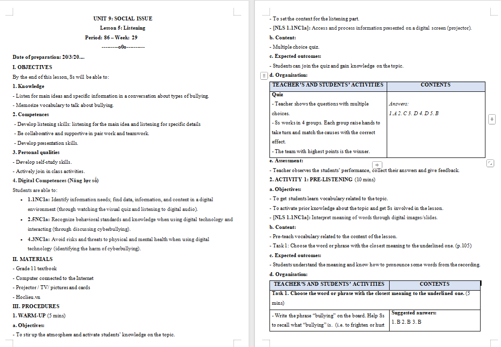 Giáo án Tiếng Anh 11 Unit 9: Listening