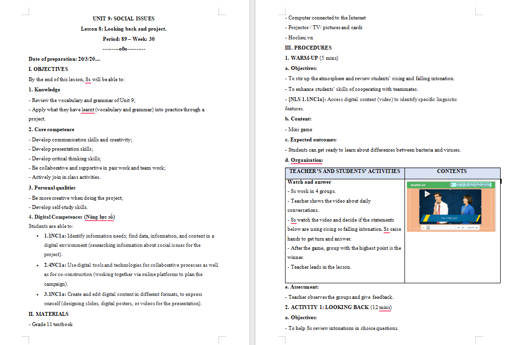 Giáo án Tiếng Anh 11 Unit 9: Looking Back trình bày dưới dạng file PowerPoint + Word đã tích hợp năng lực số dễ dàng chỉnh sửa, bổ sung. Với bố cục rõ ràng, nội dung bám sát chương trình và các hoạt động tương tác đa dạng, giáo án không chỉ giúp học sinh phát triển kỹ năng nghe - nói mà còn tạo hứng thú học tập, khuyến khích các em tự tin tham gia vào các hoạt động trên lớp. Đồng thời giúp quý thầy cô tiết kiệm thời gian làm bài giảng điện tử cho riêng mình. Vậy sau đây là nội dung chi tiết giáo án Tiếng Anh 11 Unit 9: Looking Back, mời các bạn tải tại đây.