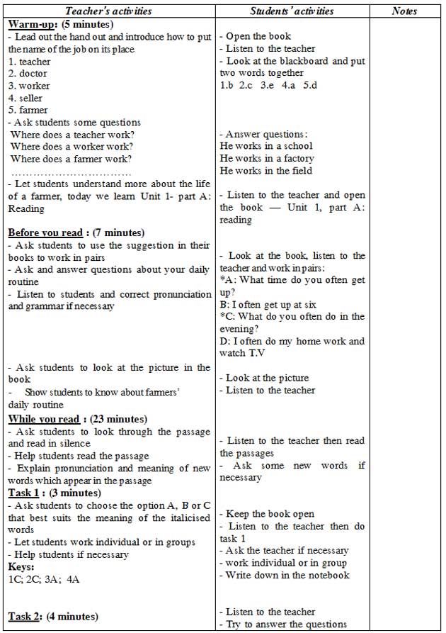 III. Teaching aids: Student’s book and pictures showing farmers’ daily routines, etc.