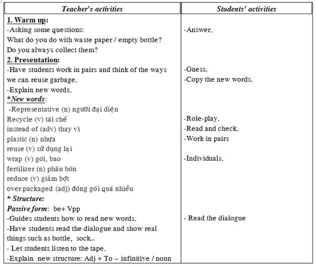 Giáo án môn Tiếng Anh lớp 8 bài Recycling