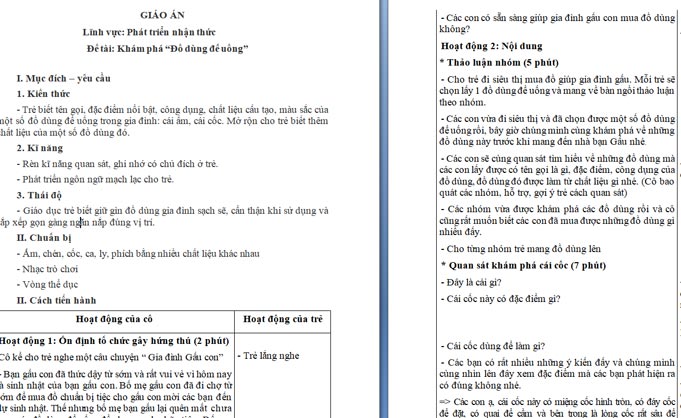 Ngoài File PowerPoint, giáo án tìm hiểu về đồ dùng để uống còn có file Word có thể tải về và chỉnh sửa, mời các cô tham khảo.