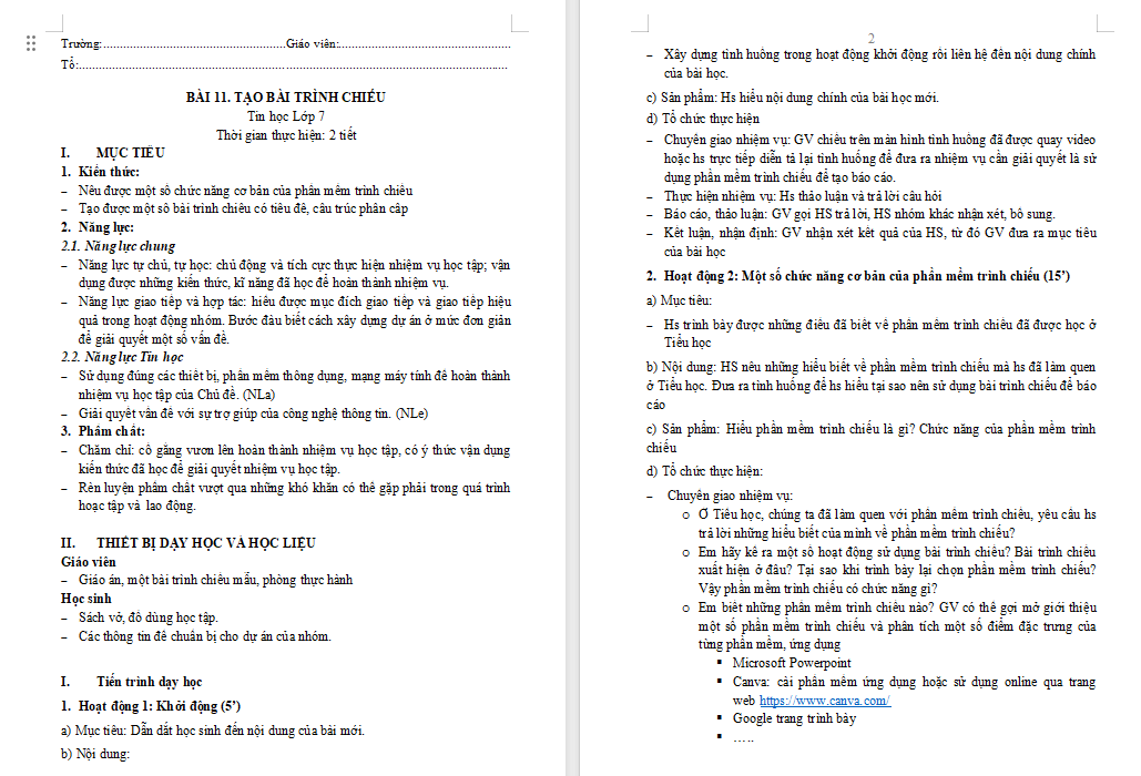 Giáo án Tin học 7 Bài 11 Tạo bài trình chiếu là tài liệu rất hữu ích được biên soạn cả dạng Word + PPT. Qua đó giúp quý thầy cô tiết kiệm thời gian làm bài giảng điện tử cho riêng mình.