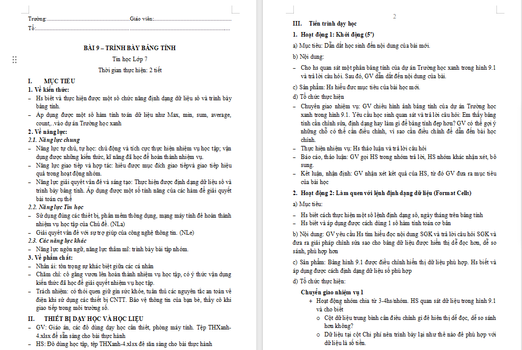 Giáo án Tin học 7 Bài 9: Trình bày bảng tính là tài liệu rất hữu ích được biên soạn cả dạng Word + PPT. Qua đó giúp quý thầy cô tiết kiệm thời gian làm bài giảng điện tử cho riêng mình.