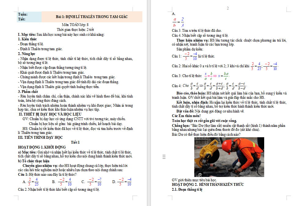 Giáo án Toán 8 Bài 1: Định lí Thalès trong tam giác là tài liệu rất hữu ích được biên soạn cả dạng Word + PPT. Qua đó giúp quý thầy cô tiết kiệm thời gian làm bài giảng điện tử cho riêng mình.
