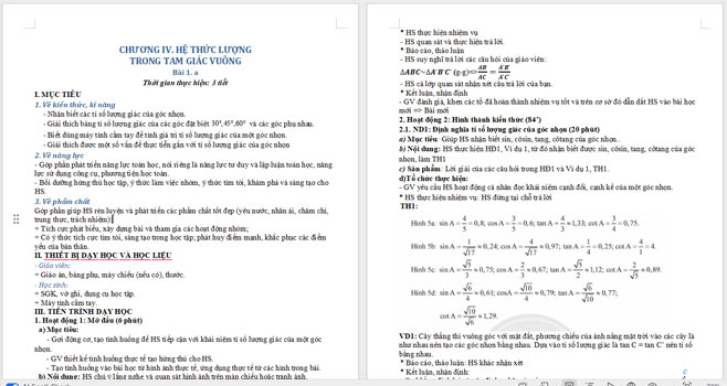 Giáo án toán 9 bài 1 Tỉ số lượng giác của góc nhọn được thiết kế nhằm giúp học sinh bước đầu làm quen với khái niệm lượng giác trong tam giác vuông, nắm vững các tỉ số sin, cos, tan và cot. Nội dung trong giáo án toán này được trình bày mạch lạc, kết hợp với hình ảnh minh họa và bài tập thực tế, giúp thầy cô giảng dạy hiệu quả và học sinh tiếp thu kiến thức một cách trực quan, dễ hiểu.