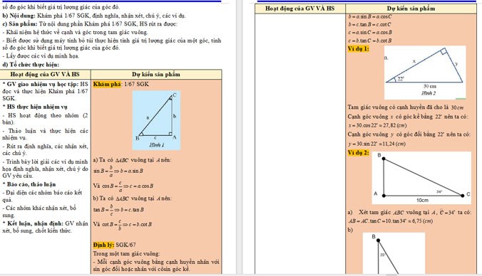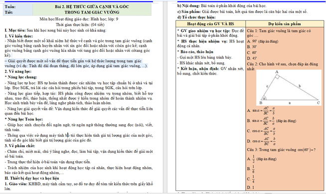 Mời các thầy cô kích vào nút Tải về dưới đây để xem đầy đủ nội dung giáo án Toán 9 CTST chương 4 bài 2 Hệ thức giữa cạnh và góc trong tam giác vuông.