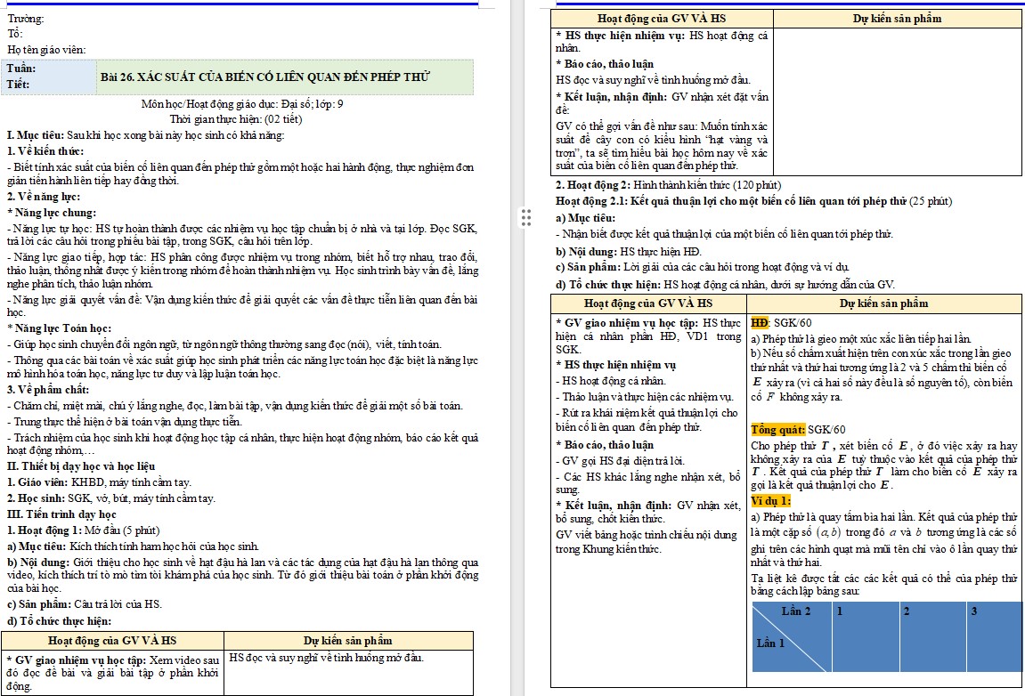 Giáo án Toán 9 Bài 26: Xác suất của biến cố liên quan tới phép thử trong bài viết sau đây là mẫu giáo án môn Toán 9 Bài 26 KNTT file word và giáo án điện tử Toán 9 KNTT Bài 26. Mẫu giáo án Toán 9 Kết nối tri thức được biên soạn đầy đủ và đẹp mắt sẽ là nguồn tài liệu tham khảo bổ ích cho các thầy cô giáo trong công tác soạn giáo án bài giảng. Sau đây là nội dung chi tiết, mời các thầy cô cùng xem và tải về sử dụng.