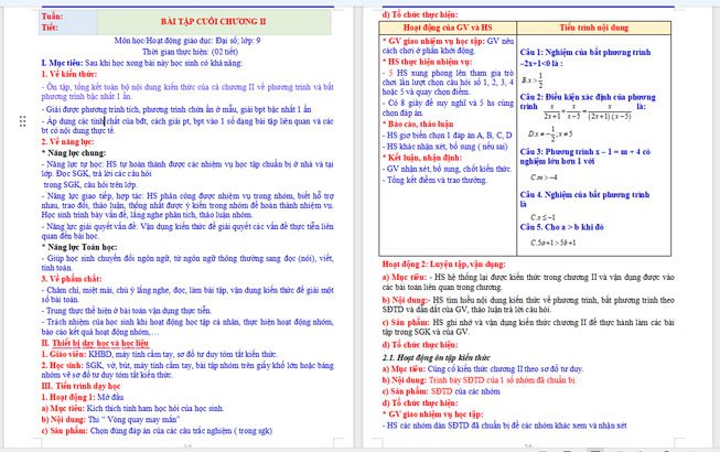 Giáo án Toán 9 Bài tập cuối chương 2 sách chân trời sáng tạo được biên soạn đầy đủ và đẹp mắt sẽ là nguồn tài liệu tham khảo bổ ích cho các thầy cô giáo trong công tác soạn giáo án bài giảng. Sau đây là nội dung chi tiết, mời các thầy cô cùng xem và tải về sử dụng.