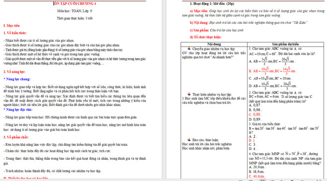 Giáo án toán 9 bài Ôn tập cuối Chương 4 được xây dựng nhằm hệ thống hóa toàn bộ kiến thức về tỉ số lượng giác và các hệ thức trong tam giác vuông. Với cách trình bày ngắn gọn, khoa học, cùng hệ thống bài tập phân loại theo mức độ, giáo án giúp học sinh củng cố kiến thức, rèn luyện kỹ năng giải toán và chuẩn bị tốt cho các bài kiểm tra. Đây là tài liệu hữu ích hỗ trợ thầy cô tổ chức tiết ôn tập hiệu quả, sát với thực tế giảng dạy.