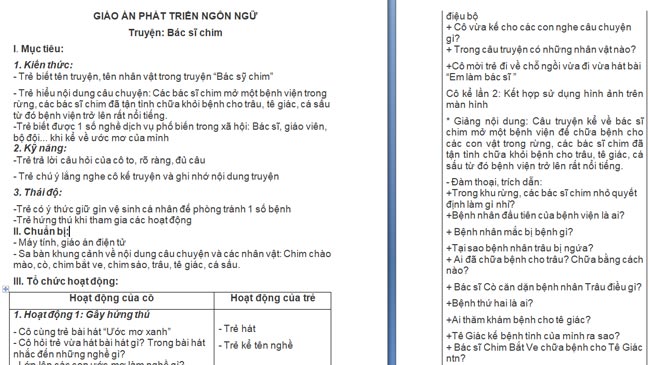 Ngoài File PowerPoint, giáo án truyện “Bác sĩ chim” còn có file Word có thể tải về và chỉnh sửa, mời các cô tham khảo.