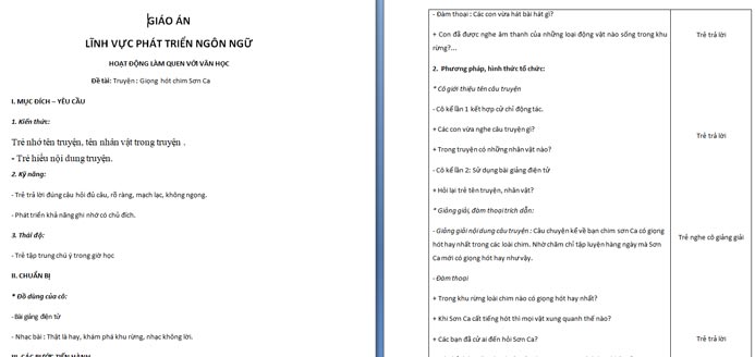 Ngoài File PowerPoint, giáo án truyện “Giọng hót chim sơn ca” còn có file Word có thể tải về và chỉnh sửa, mời các cô tham khảo.