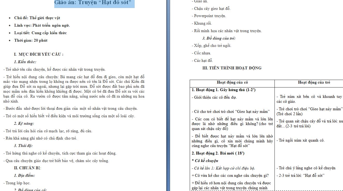 Ngoài File PowerPoint, giáo án truyện ‘Hạt đỗ sót’ còn có file Word có thể tải về và chỉnh sửa, mời các cô tham khảo.