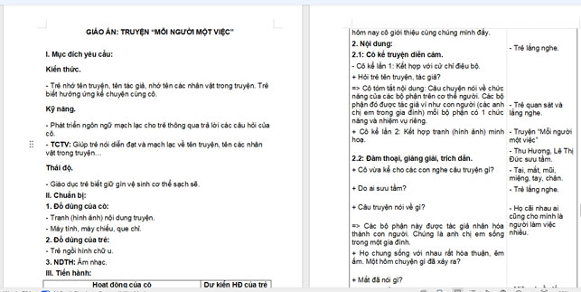 Ngoài File PowerPoint, giáo án truyện “Mỗi người một việc” còn có file Word có thể tải về và chỉnh sửa, mời các cô tham khảo.