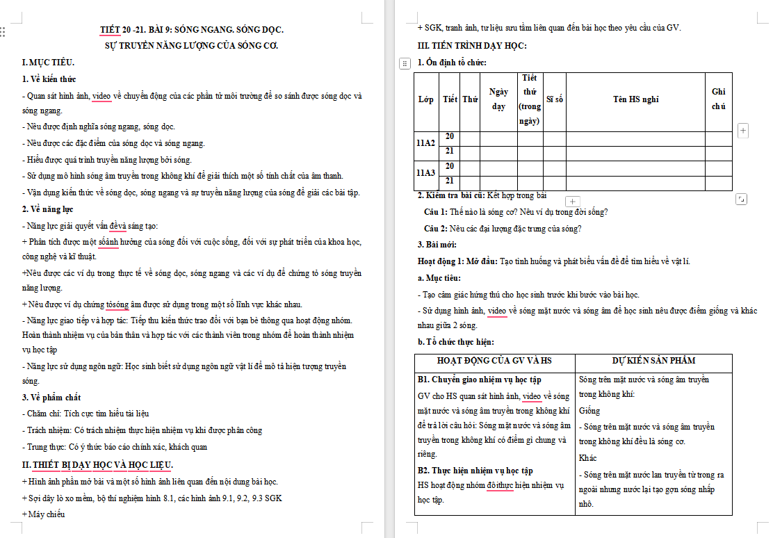 Giáo án Vật lí 11 Bài 9: Sóng ngang, Sóng dọc, Sự truyền năng lượng của sóng cơ
