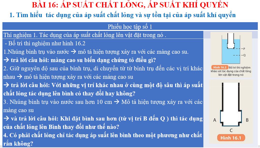 Giáo án Vật lý 8 – Bài 16: Áp suất chất lỏng, áp suất khí quyển là một tài liệu giảng dạy thiết thực, được biên soạn công phu theo định hướng phát triển năng lực học sinh, phù hợp với chương trình sách giáo khoa Kết nối tri thức với cuộc sống.