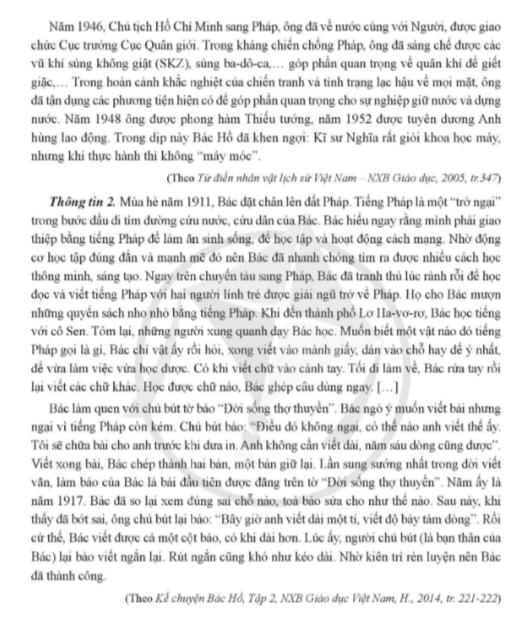 + Bác Hồ luôn chú ý, học hỏi tiếng Pháp từ những người xung quanh, ví dụ: khi còn ở trên chuyến tàu sang Pháp, Bác tranh thủ lúc rảnh rỗi để học đọc và viết tiếng Pháp với hai người lính trẻ; Khi đến thành phố Lơ Ha-vơ-rơ, Bác học tiếng với cô Sen,…