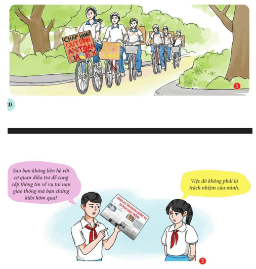 - Bức ảnh 2: bạn học sinh nam đang góp ý và đề nghị bạn học sinh nữ: liên hệ với cơ quan điều tra để cung cấp thông tin về vụ tai nạn giao thông (mà bạn nữ chứng kiến).