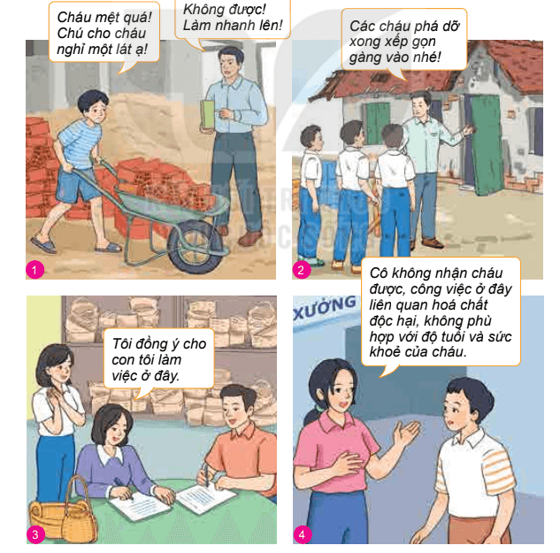 - Bức tranh số 4: người phụ nữ đã thực hiện đúng khoản 1 điều 147 của Bộ luật lao động năm 2019, vì cô ấy đã: từ chối sử dụng lao động chưa thành niên trong các công việc liên quan đến hóa chất độc hại.