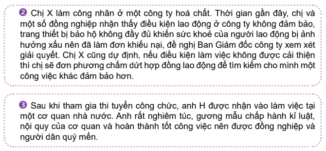 Khám phá trang 61 GDCD 8: a) Theo em, trong trường hợp 2 và 3, các nhân vật đã thực hiện quy định của pháp luật về quyền và nghĩa vụ lao động của công dân như thế nào?