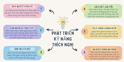 - Chấp nhận sự thay đổi: kiểm soát và hạn chế cảm xúc tiêu tiêu cực, sẵn sàng đối mặt với khó khăn và thách thức, tận dụng cơ hội để thích ứng.