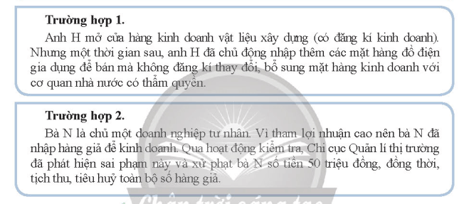 - Trường hợp 1. anh H đã có hành vi vi phạm là: buôn bán sản phẩm không có trong giấy phép kinh doanh. Cụ thể: anh H đăng kí kinh doanh mặt hàng vật liệu xây dựng, tuy nhiên, anh H đã nhập thêm các mặt hàng đồ điện gia dụng để bán mà không đăng kí thay đổi, bổ sung mặt hàng kinh doanh với cơ quan nhà nước có thẩm quyền.