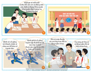 + Tranh số 1: các bạn học sinh viết thư để cảm ơn các chiến sĩ đang đóng quân ở hai quần đảo Hoàng Sa và quần đảo Trường Sa.