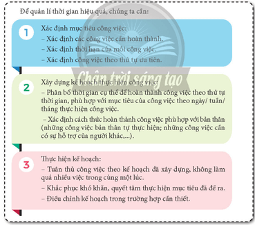 - Sự cần thiết: Quản lí thời gian hiệu quả giúp chúng ta chủ động trong cuộc sống; nâng cao năng suất, hiệu quả công việc; giảm áp lực, tạo động lực, từng bước hoàn thiện bản thân.
