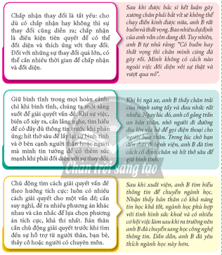 - Giữ bình tĩnh trong mọi hoàn cảnh. Vì: chỉ khi bình tĩnh, chúng ta mới sáng suốt để giải quyết vấn đề. Khi sự việc, biến cố xảy ra, cần lắng nghe, tìm hiểu để có đầy đủ thông tin trước khi phản ứng; hít thở sâu để lấy lại sự bình tĩnh và ở bên cạnh người thân hoặc người mà mình tin tưởng để có thêm sức mạnh khi phải đối diện với sự thay đổi.