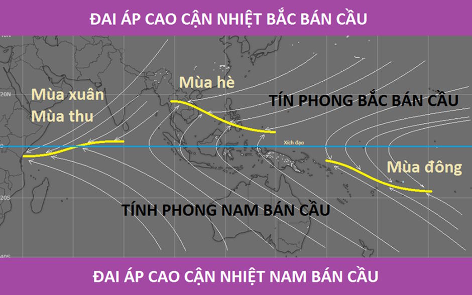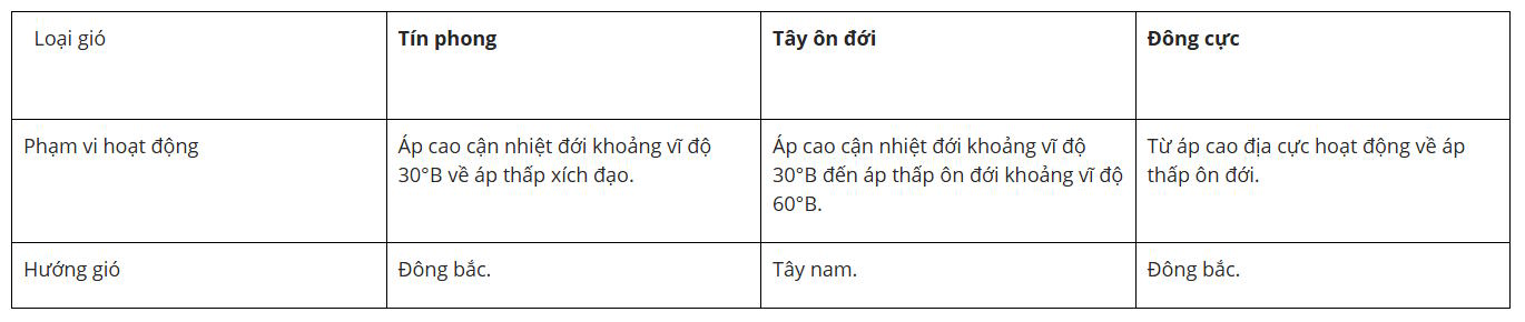 - Hướng gió: đông bắc ở bán cầu Bắc và đông nam ở bán cầu Nam.
