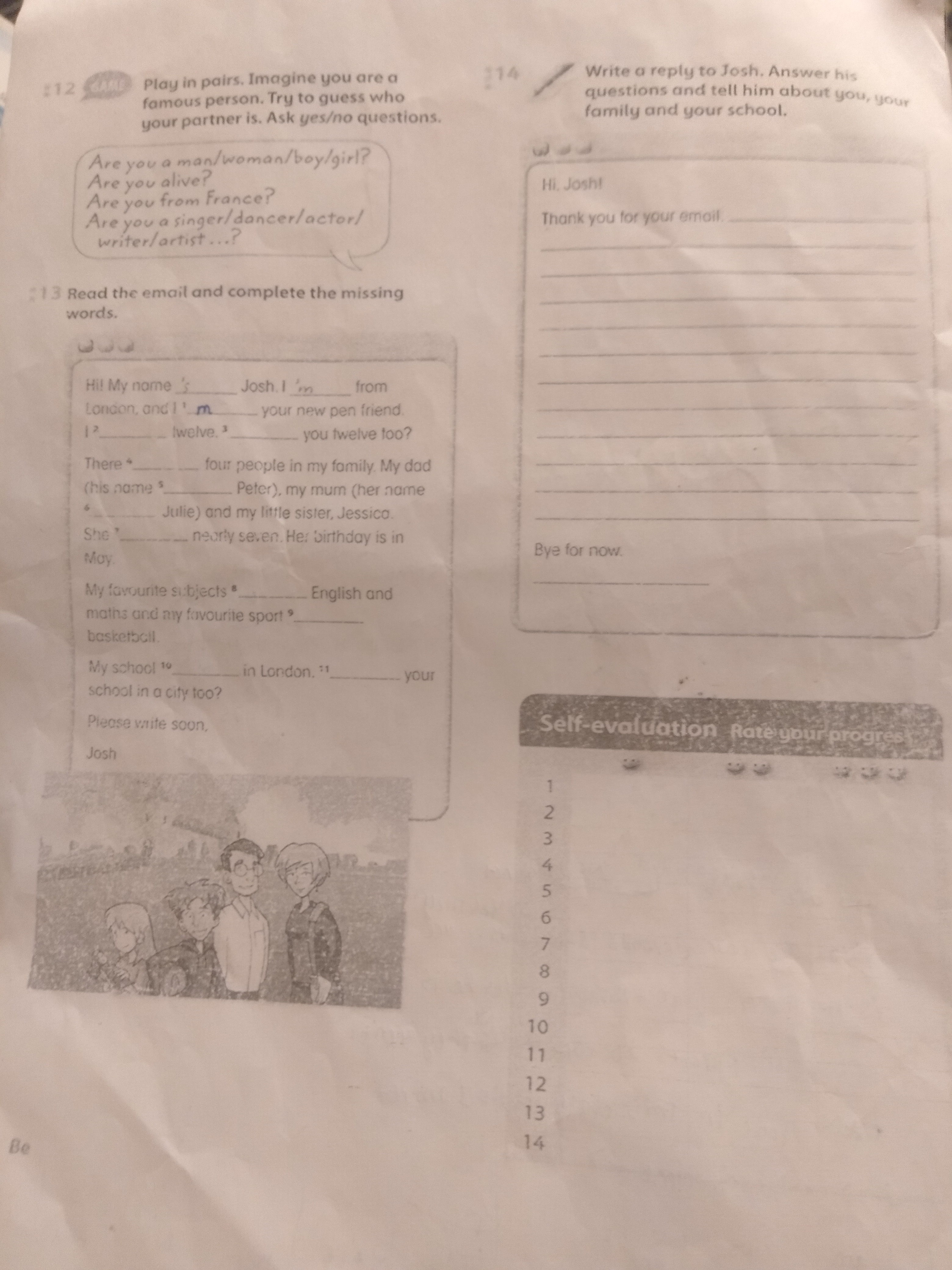 Write a reply to Josh. Answer his questions and tell him about you, your family and your school