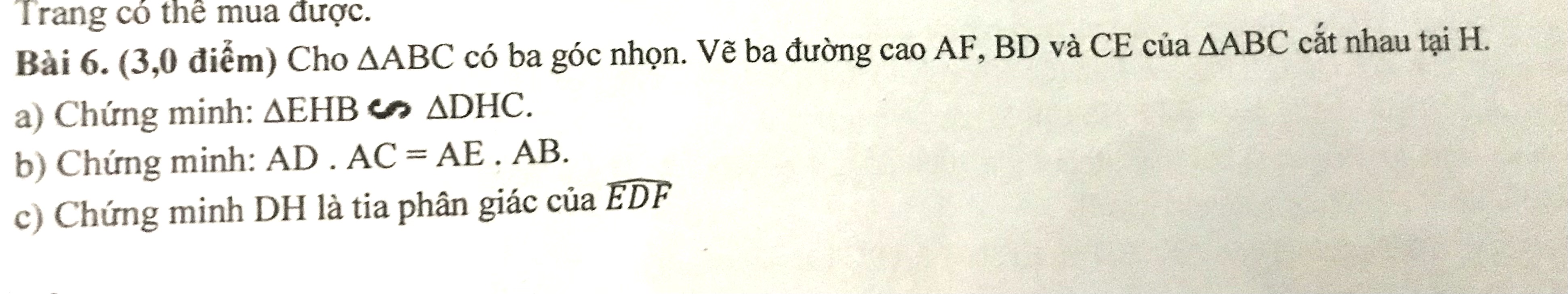 Cho tam giác ABC có 3 góc nhọn. Vẽ ba đường cao AF, BD và CE cắt nhau tại H