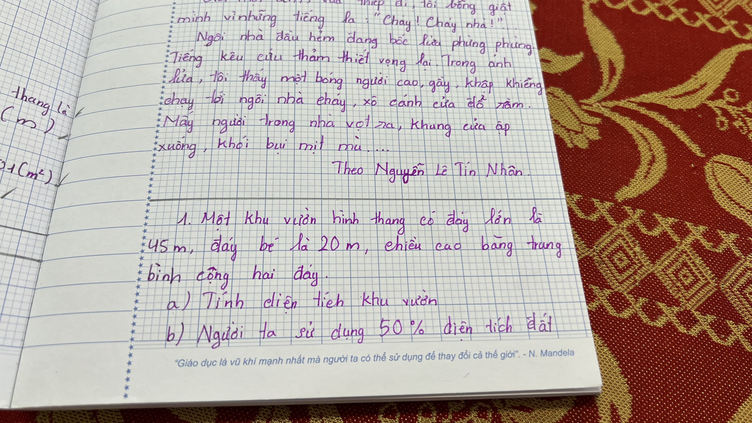 Một khu vườn hình thang có đáy lớn là 45m, đáy bé là 20m