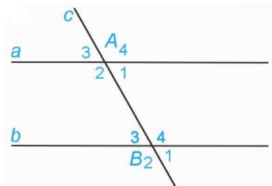 – Cho đường thẳng c cắt hai đường thẳng a và b lần lượt tại A và B tạo thành bốn góc đỉnh A, bốn góc đỉnh B. Mỗi cặp gồm một góc đỉnh A và một góc đỉnh B.