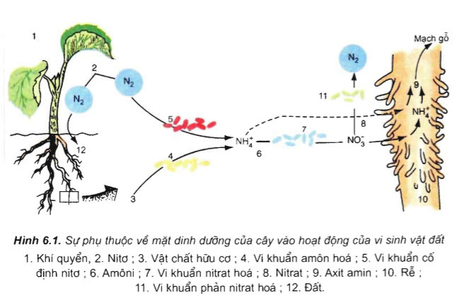 Hãy chỉ ra trên hình 6.1 con đường cố định nitơ phân tử xảy ra ở trong đất và sản phẩm của quá trình đó.