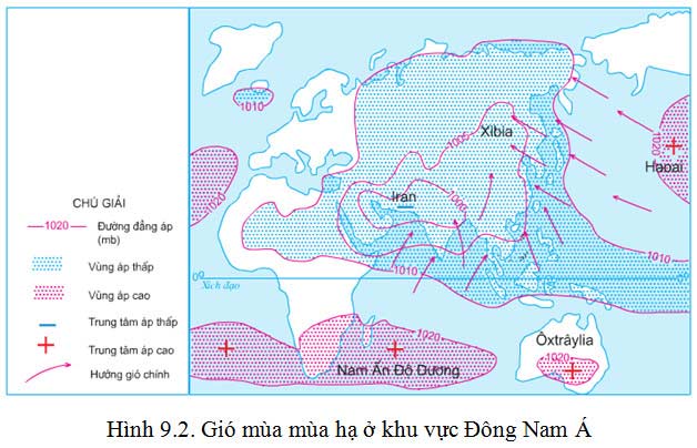 Dựa vào hình 9.2, hãy cho biết các trung tâm áp cao hình thành gió mùa mùa hạ ở Việt Nam ; hướng di chuyển và tính chất của gió này.