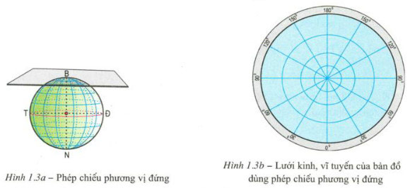 Dựa vào hình 1.3b, em hãy cho biết theo phương phép chiếu hình này, khu vực nào của bản đồ chính xác, khu vực nào kém chính xác?