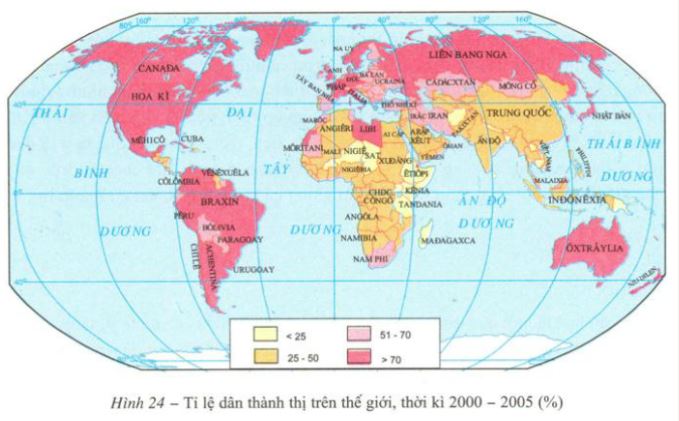 - Những châu lục và khu vực nào có tỉ lệ dân cư thành thị thấp nhhất?