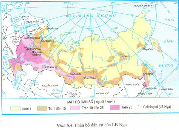 Dựa vào hình 8.4, hãy cho biết sự phân bố dân cư LB Nga. Sự phân đó có thuận lợi và khó khăn gì với sự phát triển kinh tế?