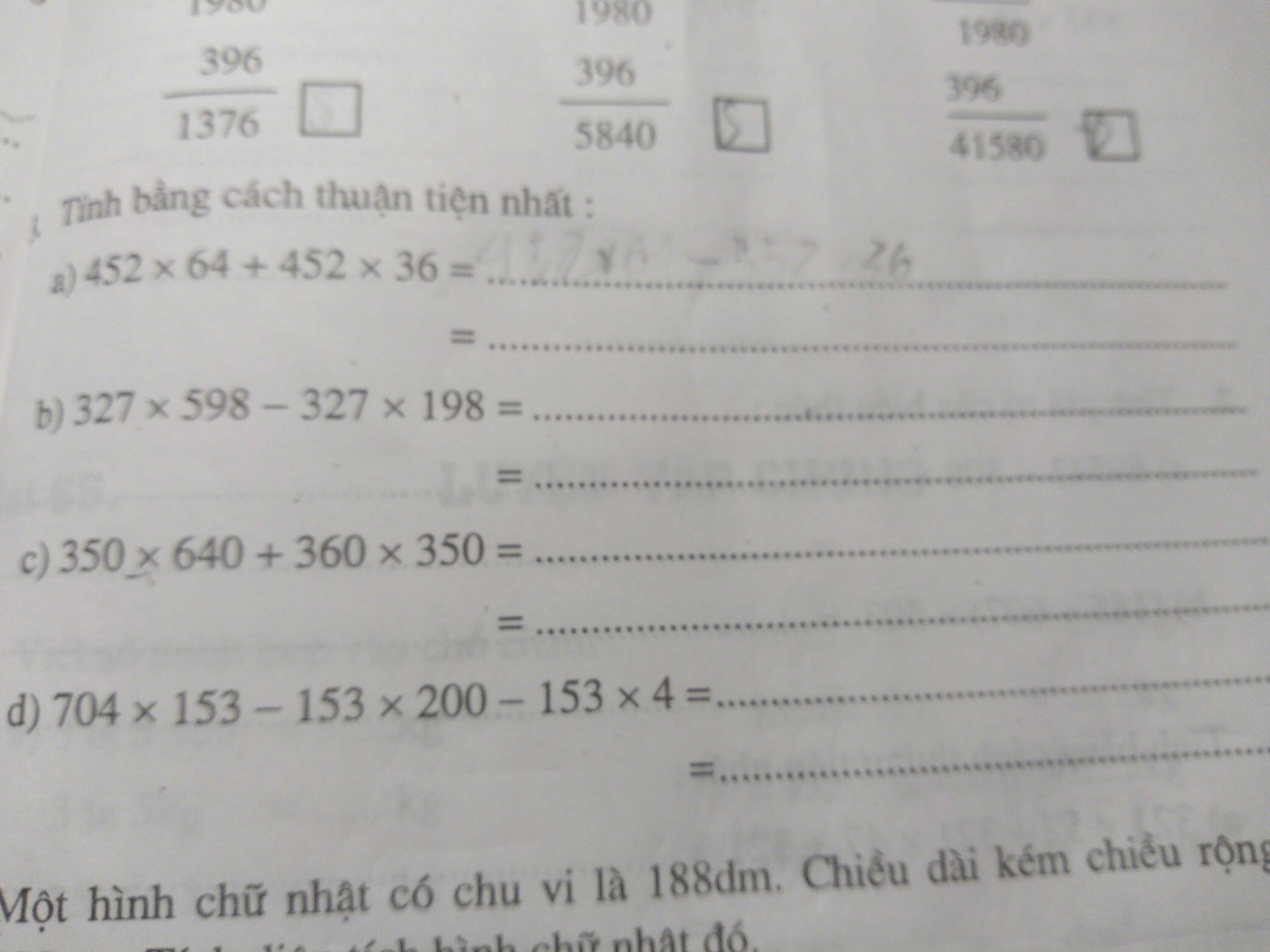 Tính bằng cách thuận tiện nhất: a) 452 × 64 + 452 × 36 =