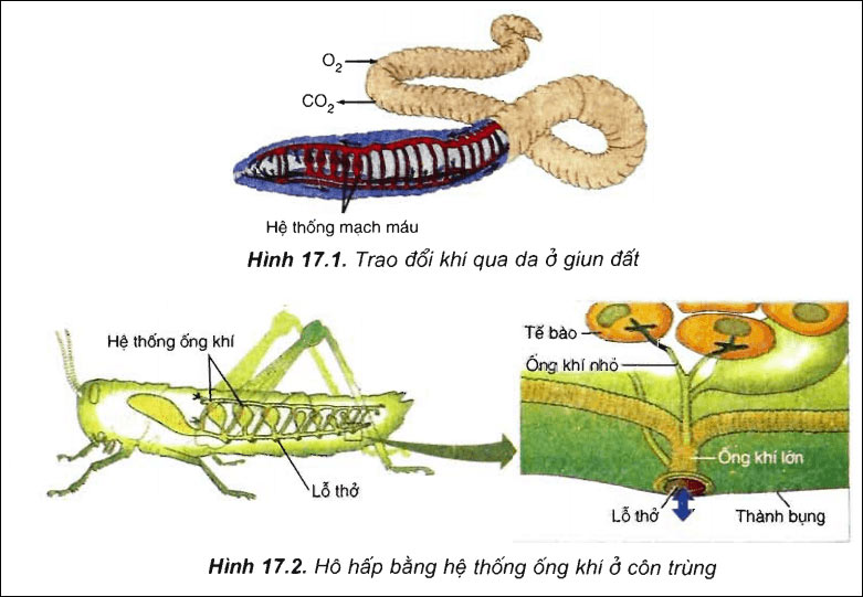 Quan sát hình 17.1 và hình 17.2, hãy mô tả quá trình trao đổi khí ở giun đất và côn trùng.