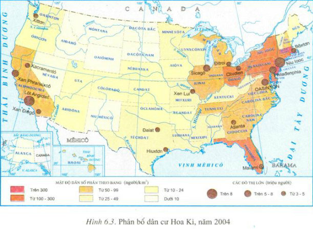 Quan sát hình 6.3, hãy nhận xét sự phân bố dân cư của Hoa Kì?