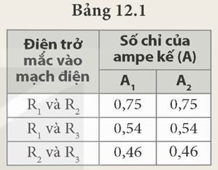 - Lặp lại thí nghiệm với các cặp điện trở R1, R3 và R2, R3, ghi số chỉ của ampe kế vào vở theo mẫu tương tự Bảng 12.1.